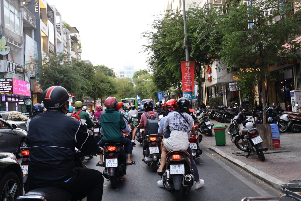 I Saigon er trafikken en kunstform i sig selv, der er dynamik på vejene. Rødt lys i vejkrydsene, anses ofte som værende vejledende, motorcykler overhaler både indenom og udenom, og der foretages kamikaze-agtig fletværk ind og ud mellem trafikanter. Det virker som om de har set for meget Tour de France. Lige som man har set det meste, ser man en familie på fem – to voksne og tre børn – presset sammen på en enkelt motorcykel, og der er kun råd til at de voksne bærer styrthjælme.