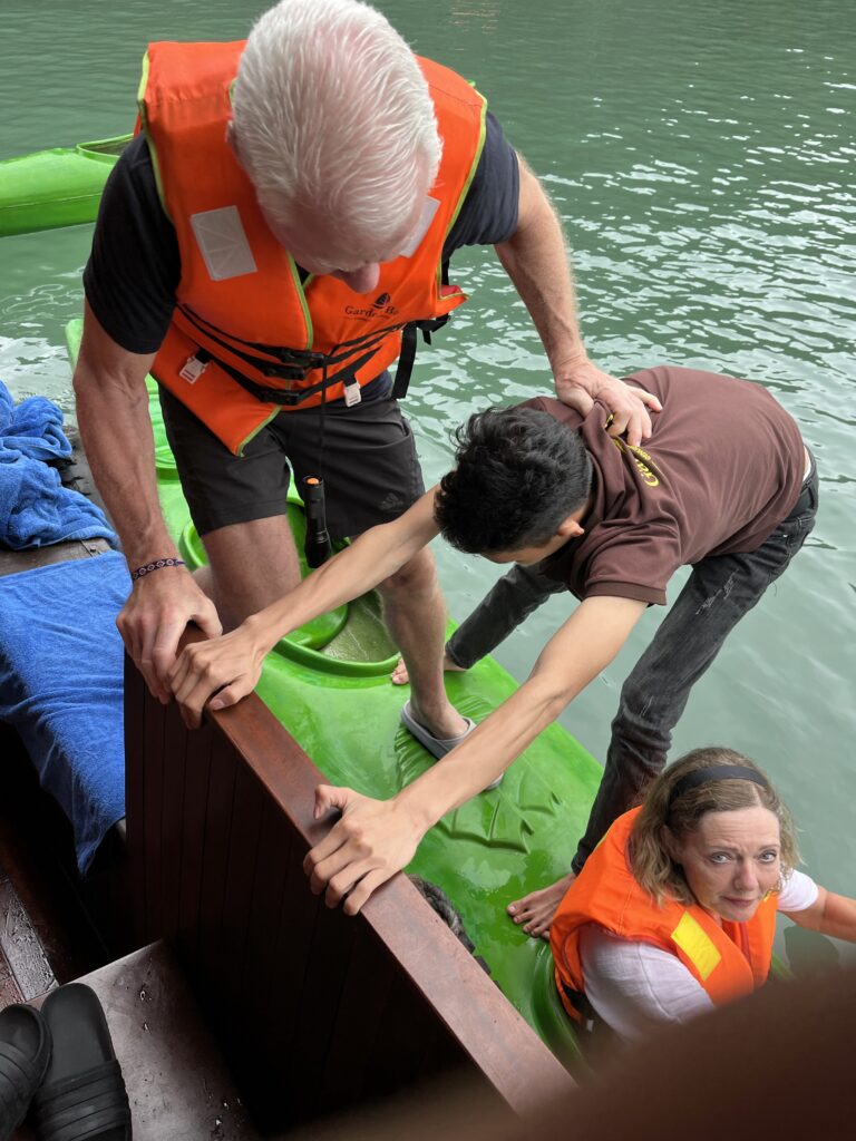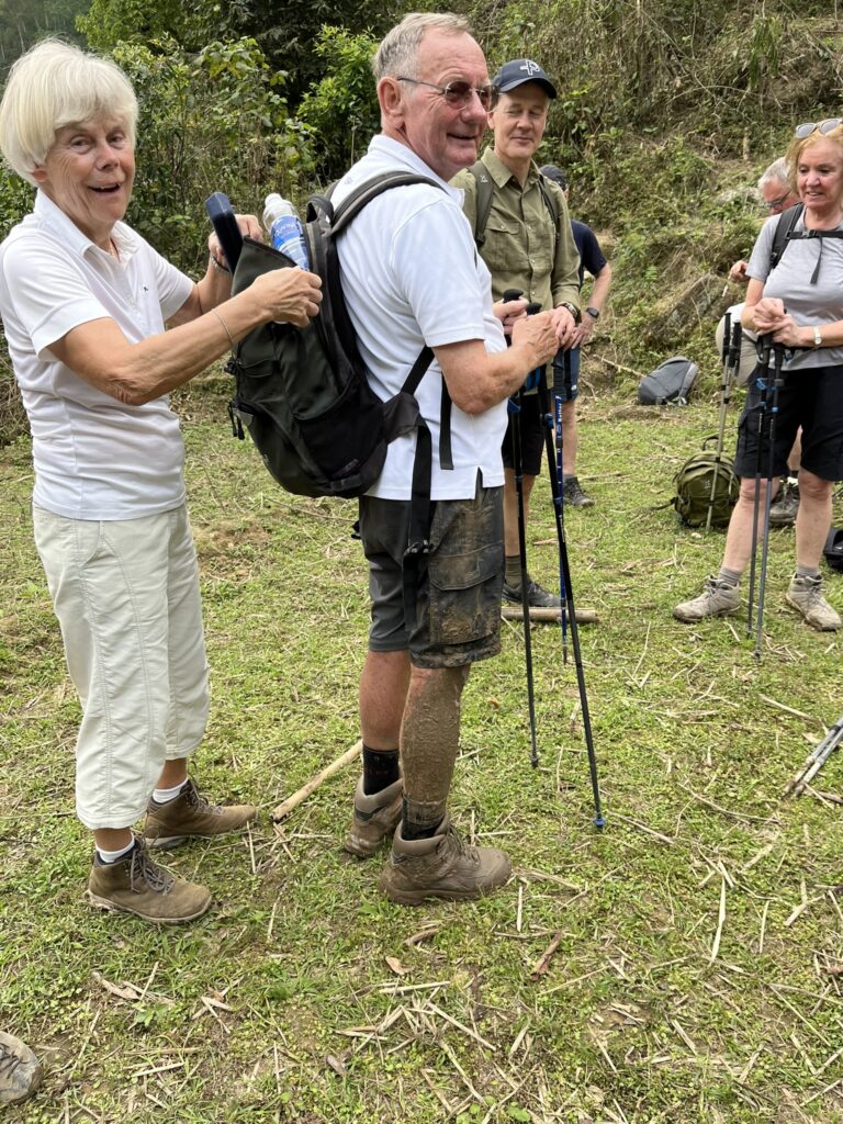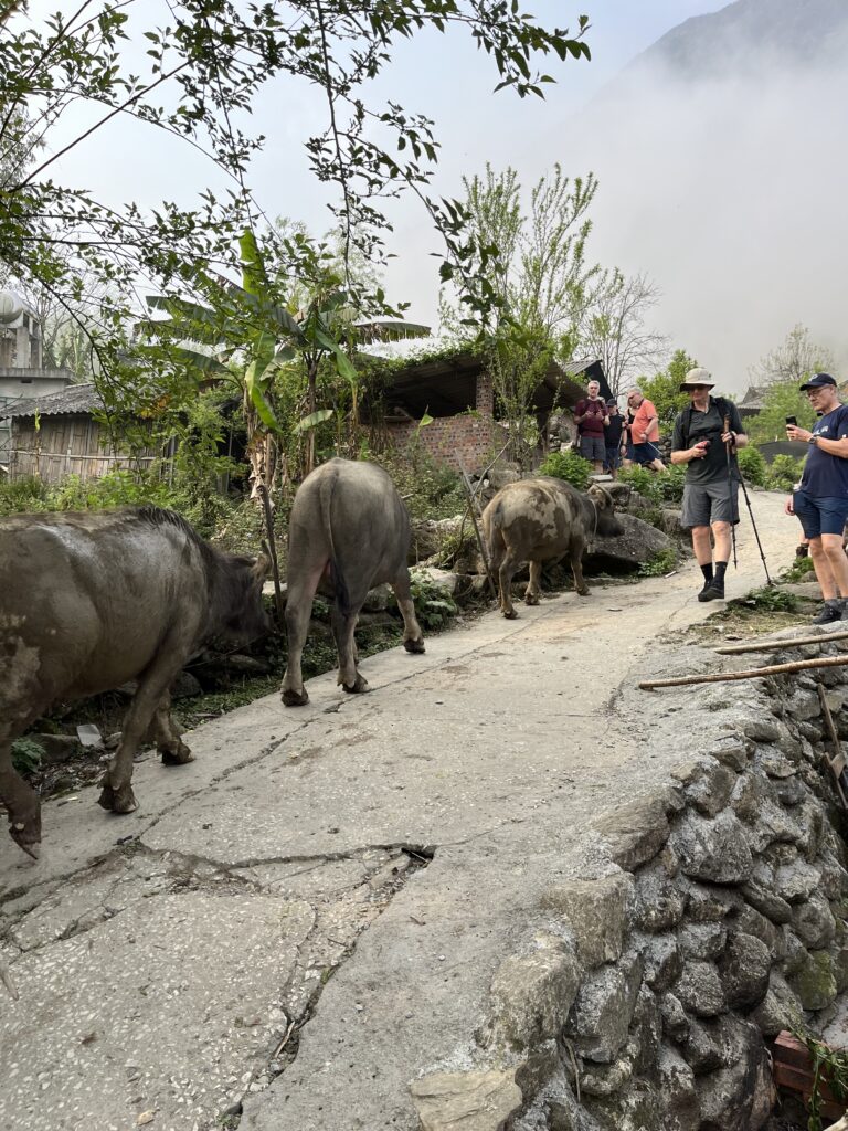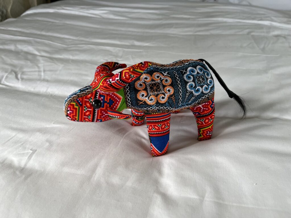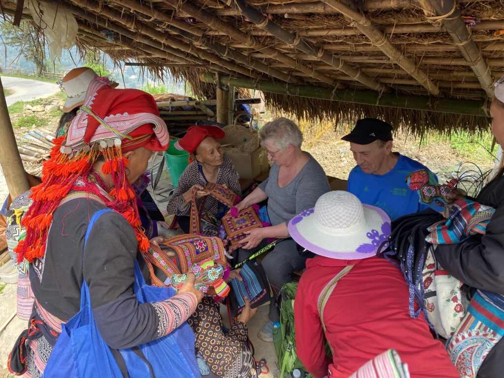 Maja ville gerne købe en taske, og da vi uden for Lodgen bevæger os hen mod et “salgssted” (en træ-halvtag), kommer den første med en kollektion af varer. Vi bliver tilbudt en skamle, at sidde på, og pludselig vælter det ind med Red Dao kinder, der hver har deres varer med. “You buy from me”, lyder det på kryds og tværs. Jeg tror der var mindst 10 kvinder. Maja fik tilbudt tasker, pudebetræk, sjaler, punge, armbånd og dyr. Jeg selv skulle ikke købe noget, men på mystisk vis, og jeg ved ikke hvordan det gik til, fik jeg købt en vandbøffel. Vores guide, Peter, kom og redede os ud fra halvtaget, men kvinderne fulgte med, helt hen til Lodgen, hvor en vagt fik spæret kvindernes adgang.
