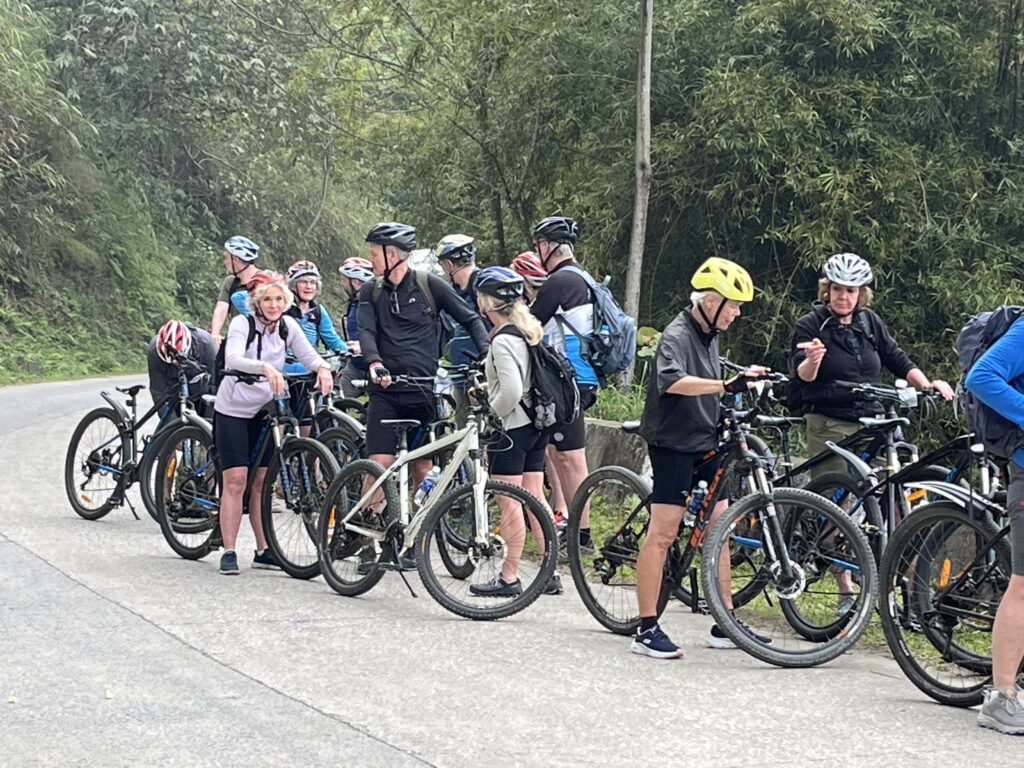 Cyklisterne samlet efter en stejl nedkørsel fra bjerget